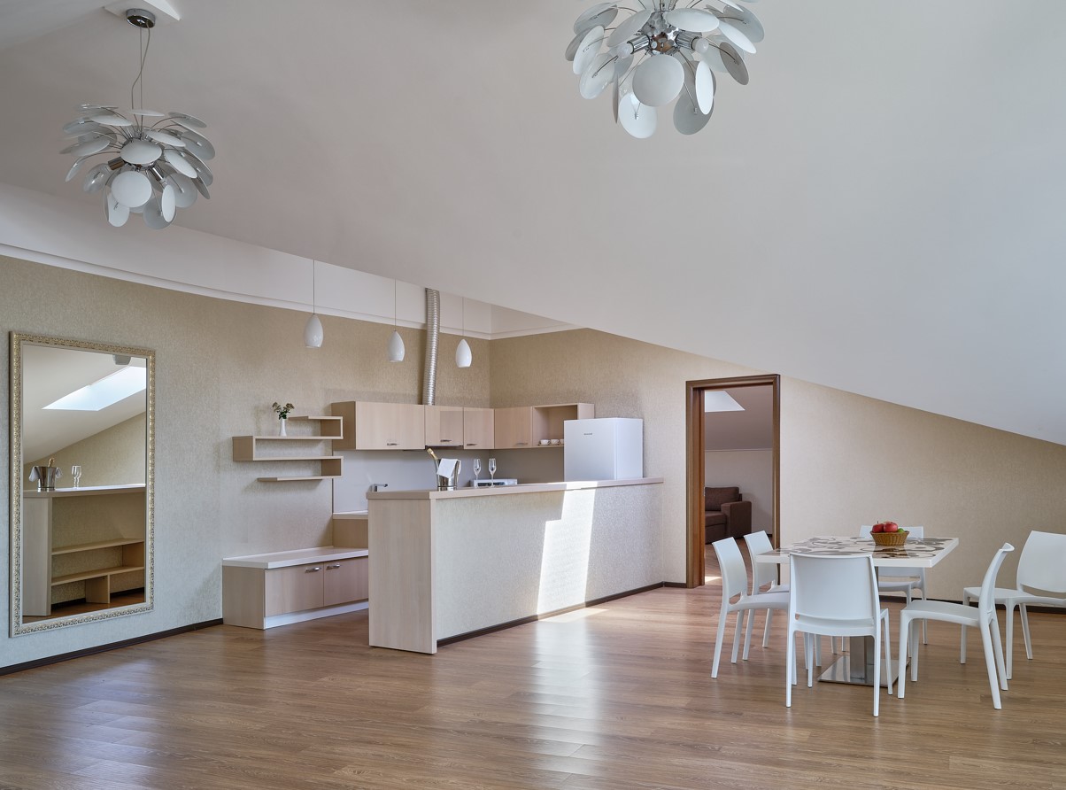 Площадь номера - 242 кв.м. 2 осн. места. 4 доп. места. Балкон. Мебель: гардеробная, кровать двуспальная, кухонная мебель, набор мягкой мебели, прикроватные тумбочки, столик журнальный, стулья. Мини-кухня. Оборудование: гладильная доска, кондиционер, микроволновая печь, набор посуды, плита электрическая (индукционная мини-поверхность), сейф, стиральная машина, телевизор, телефон, утюг, холодильник, электрочайник. Санузел: биде, с ванной/душем, тапочки, туалетные принадлежности, фен, халат. Сервис: Wi-Fi бесплатно, смена полотенец, смена постельного белья, уборка номера.